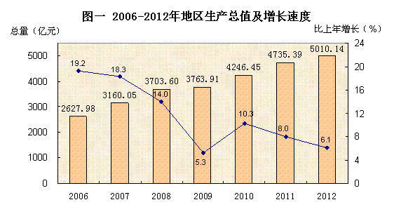 初步核算,2012年东莞生产总值(GDP)5010.14亿元,比上年增长6.1%。分产业看,第一产业增加值19.19亿元,增长1.2%;第二产业增加值2351.78亿元,增长5.6%;第三产业增加值2639.17亿元,增长6.7%。三大产业比例为0.4:46.9:52.7。人均地区生产总值60556元,增长5.7%。